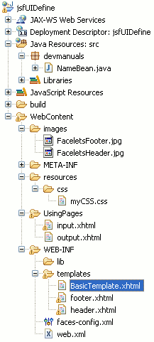 <?xml version="1.0" encoding="ISO-8859-1" ?> <!DOCTYPE html PUBLIC "-//W3C//DTD XHTML 1.0 Transitional//EN" "http://www.w3.org/TR/xhtml1/DTD/xhtml1-transitional.dtd"> <html xmlns="http://www.w3.org/1999/xhtml" xmlns:ui="http://java.sun.com/jsf/facelets" xmlns:h="http://java.sun.com/jsf/html" xmlns:f="http://java.sun.com/jsf/core"> <h:head> </h:head> <f:view> <h:body> <h:outputStylesheet library="css" name="myCSS.css" target="head" /> <h:panelGrid columns="1" styleClass="t1"> <h:graphicImage value="/images/FaceletsHeader.jpg" /> <h:dataTable value="" title="ui:composition tag example"> <h:column> <h:outputLink value="#home"> <h:outputText value="Home" /> </h:outputLink> </h:column> <h:column> <h:outputLink value="#about"> <h:outputText value="About Us" /> </h:outputLink> </h:column> <h:column> <h:outputLink value="#advertise"> <h:outputText value="Advertise" /> </h:outputLink> </h:column> </h:dataTable> </h:panelGrid> </h:body> </f:view> </html>