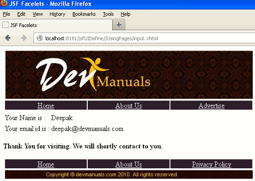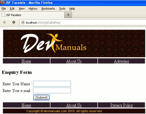 2. When you will make the changes into the value of name attribute in either of the tag i.e. ui:insert tag in BasicTemplate.xhtml file or ui:define tag in input.xhtml file then you will see that the contents are not displaying in the web page as follows :