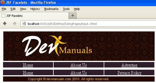 <?xml version="1.0" encoding="ISO-8859-1" ?> <!DOCTYPE html PUBLIC "-//W3C//DTD XHTML 1.0 Transitional//EN" "http://www.w3.org/TR/xhtml1/DTD/xhtml1-transitional.dtd"> <html xmlns="http://www.w3.org/1999/xhtml" xmlns:ui="http://java.sun.com/jsf/facelets" xmlns:h="http://java.sun.com/jsf/html" xmlns:f="http://java.sun.com/jsf/core"> <h:head> </h:head> <f:view> <h:body> <h:outputStylesheet library="css" name="myCSS.css" target="head" /> <h:panelGrid columns="1" styleClass="t1"> <h:dataTable value="" title="ui:composition tag example"> <h:column> <h:outputLink value="#home"> <h:outputText value="Home" /> </h:outputLink> </h:column> <h:column> <h:outputLink value="#about"> <h:outputText value="About Us" /> </h:outputLink> </h:column> <h:column> <h:outputLink value="#privacy"> <h:outputText value="Privacy Policy" /> </h:outputLink> </h:column> </h:dataTable> <h:panelGroup> <h:graphicImage value="/images/FaceletsFooter.jpg" /> </h:panelGroup> </h:panelGrid> </h:body> </f:view> </html>