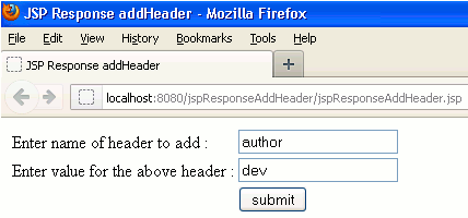 Here the example is being given will demonstrate you about how to add response header. In this example I have created a JSP page where designed a form to take the input from user where user can add header and their value. Then used the containsHeader() method to check whether the header name is given by user is already existed or not, if this statement returns false then the specified header name will be added using addHeader() method. Further I have checked again for the existence of specified header name.