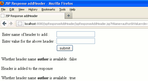 <%@ page language="java" contentType="text/html; charset=ISO-8859-1" pageEncoding="ISO-8859-1"%> <%@ page import="java.net.URL, java.util.*" %> <!DOCTYPE html PUBLIC "-//W3C//DTD HTML 4.01 Transitional//EN" "http://www.w3.org/TR/html4/loose.dtd"> <html> <head> <meta http-equiv="Content-Type" content="text/html; charset=ISO-8859-1"> <title>JSP Response addHeader</title> </head> <body> <form> <table> <tr> <td>Enter name of header to add : </td> <td><input type="text" name="hName"/></td> </tr> <tr> <td>Enter value for the above header :</td> <td><input type="text" name="hValue"/></td> </tr> <tr> <td></td><td><input type="submit" value="submit"/></td> </tr> </table> </form> <% String hName = request.getParameter("hName"); String hValue = request.getParameter("hValue"); if(hName != null) { boolean bol = response.containsHeader(hName); %> <p>Whether header name <b><%=hName %></b> is available : <% out.println(bol);%></p> <% if(bol== false) { response.addHeader(hName, hValue); out.println("Header is added to the response"); } else { out.println("Specified header is already existed"); } %> <p>Whether header name <b><%=hName %></b> is available : <% out.println(response.containsHeader(hName));%></p> <% } %> </body> </html>