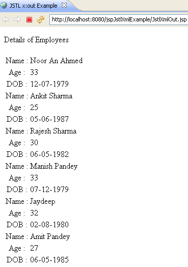 Here the example is given below will demonstrate you about the use of <x:out> tag of JSTL. In this example at first I have created an XML file named employeeDetail.xml that contains some records of Employees like name, age, dob (date_of_birth) of an employee. Then created a JSP page where used the <c:import> tag of JSTL core to retrieve the XML document and stores it to the variable 'emp' by using 'var' attribute of this tag, then used the <x:parse> tag to parse the document using the attribute 'doc' and stores the result into the variable 'record' using the attribute 'var' and to iterate over all the elements I have used the <x:forEach> tag and stored the value in the variable 'n' using 'var' attribute of this tag then in further statements I have used the <x:out> tag where the 'select' attribute will evaluate the XPath expression and output the result.