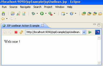 <%@ page language="java" contentType="text/html; charset=ISO-8859-1" pageEncoding="ISO-8859-1"%> <!DOCTYPE html PUBLIC "-//W3C//DTD HTML 4.01 Transitional//EN" "http://www.w3.org/TR/html4/loose.dtd"> <%@page import="pack.Bean"%><html> <title>JSP useBean Action Example</title> <head> </head> <body> <jsp:useBean id="useBean" class="pack.Bean"> <jsp:setProperty name="useBean" property="str" value="Welcome !" /> </jsp:useBean> <p> <jsp:getProperty name="useBean" property="str" /></p> </body> </html>