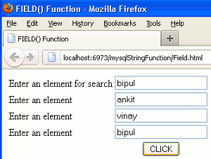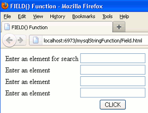 <!DOCTYPE html PUBLIC "-//W3C//DTD HTML 4.01 Transitional//EN" "http://www.w3.org/TR/html4/loose.dtd"> <html> <head> <meta http-equiv="Content-Type" content="text/html; charset=ISO-8859-1"> <title>FIELD() Function</title> </head> <body> <form method="get" action="MysqlFieldServlet"> <table> <tr> <td>Enter an element for search</td> <td><input type="text" name="txtName"/></td> </tr> <tr> <td>Enter an element</td> <td><input type="text" name="txtName1"/></td> </tr> <tr> <td>Enter an element</td> <td><input type="text" name="txtName2"/></td> </tr> <tr> <td>Enter an element</td> <td><input type="text" name="txtName3"/></td> </tr> <tr> <td></td> <td align="center"><input type="submit" value="CLICK"/></td> </tr> </table> </form> </body> </html>