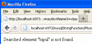 import java.io.IOException; import java.io.PrintWriter; import java.sql.SQLException; import java.sql.DriverManager; import java.sql.PreparedStatement; import java.sql.Connection; import java.sql.ResultSet; import javax.servlet.ServletException; import javax.servlet.http.HttpServlet; import javax.servlet.http.HttpServletRequest; import javax.servlet.http.HttpServletResponse; public class MysqlFieldServlet extends HttpServlet { public void doGet(HttpServletRequest request, HttpServletResponse response) throws IOException, ServletException { response.setContentType("text/html"); PrintWriter out = response.getWriter(); String str=request.getParameter("txtName"); String str1=request.getParameter("txtName1"); String str2=request.getParameter("txtName2"); String str3=request.getParameter("txtName3"); String className="com.mysql.jdbc.Driver"; String url="jdbc:mysql://192.168.10.13"; String user="root"; String password="root"; Connection con; PreparedStatement ps; ResultSet rs; try { Class.forName(className); con=DriverManager.getConnection(url, user, password); String sql = "SELECT FIELD("+"'"+str+"'"+","+"'"+str1+"'"+","+"'"+str2+"'"+","+"'"+str3+"'"+")"; ps=con.prepareStatement(sql); rs=ps.executeQuery(); while(rs.next()) { int sql1=Integer.parseInt(rs.getString(1)); if(sql1==0) { out.println("Searched element "+"\""+str+"\" is not found."); } else { sql=rs.getString(1); out.println("Searched element "+"\""+str+"\" is found at "+ sql+" position"); } } } catch(SQLException sx) { out.println(sx); } catch(ClassNotFoundException cx) { out.println(cx); } } }