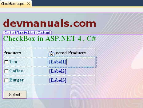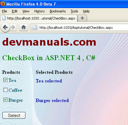 CheckBox control in ASP.NET is used to select or deselect the value. ChechBox is just like a RadioButton control in HTML. The difference between a CheckBox and a RadioButton is that once you have selected a checkbox you are able to deselect it by clicking on it again. In this example we use three ChechBox control. You can choose all of three CheckBoxs or any selection which you want. After that click on select button your selected products will be displayed.