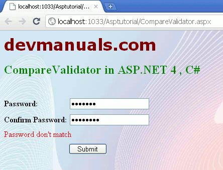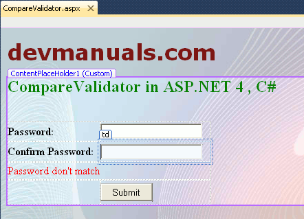 <%@ Page Title="" Language="C#" MasterPageFile="~/RoseindiaMaster.master" AutoEventWireup="true" CodeFile="CompareValidator.aspx.cs" Inherits="CompareValidator" %> <asp:Content ID="Content1" ContentPlaceHolderID="head" runat="Server"> </asp:Content> <asp:Content ID="Content2" ContentPlaceHolderID="ContentPlaceHolder1" runat="Server"> <div> <h2 style="color: Green"> CompareValidator in ASP.NET 4 , C#</h2> <br /> <table cellpadding="0" cellspacing="0" style="height: 121px; width: 295px"> <tr> <td><strong>Password: </strong></td> <td><asp:TextBox ID="passwordTextBox" runat="server" TextMode="Password" Font-Names="Verdana"></asp:TextBox></td> </tr> <tr> <td><strong>Confirm Password: </strong></td> <td><asp:TextBox ID="confirmpasswordTextBox" runat="server" TextMode="Password" Font-Names="Verdana"></asp:TextBox></td> </tr> <tr> <td colspan="2"><asp:CompareValidator ID="CompareValidator1" runat="server" ErrorMessage="Password don't match" ControlToCompare="passwordTextBox" ControlToValidate="confirmpasswordTextBox" ForeColor="Red"></asp:CompareValidator></td> </tr> <tr> <td> </td> <td><asp:Button ID="submitButton" runat="server" Text="Submit" Width="76px" OnClick="submitButton_Click" /></td> </tr> </table> </div> </asp:Content>