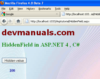 The HiddenField control is used to store a value. It is rendered element. View state, session state and cookies are used to maintain the state of a web forms page. You can use HiddenField instead of view state, session state and cookies. In this example when you click the Hidden value button the label displayed a value. When you click the button again and again the value will decrease by 1.