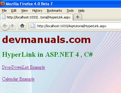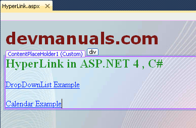 <%@ Page Title="" Language="C#" MasterPageFile="~/RoseindiaMaster.master" AutoEventWireup="true" CodeFile="HyperLink.aspx.cs" Inherits="HyperLink" %> <asp:Content ID="Content1" ContentPlaceHolderID="head" Runat="Server"> </asp:Content> <asp:Content ID="Content2" ContentPlaceHolderID="ContentPlaceHolder1" Runat="Server"> <div> <h2 style="color:Green">HyperLink in ASP.NET 4 , C#</h2> <asp:HyperLink ID="hylink1" runat="server" NavigateUrl="~/DropDownList.aspx" Target="_top" >DropDownList Example</asp:HyperLink> <br /> <br /> <asp:HyperLink ID="hylink2" runat="server" NavigateUrl="~/Calendar.aspx" Target="_top" >Calendar Example</asp:HyperLink> </div> </asp:Content>