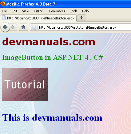 using System; using System.Collections.Generic; using System.Linq; using System.Web; using System.Web.UI; using System.Web.UI.WebControls; public partial class ImageButton : System.Web.UI.Page { protected void Page_Load(object sender, EventArgs e) { protected void ImageButton1_Click(object sender, ImageClickEventArgs e) { Label1.Text = "This is devmanuals.com"; } }