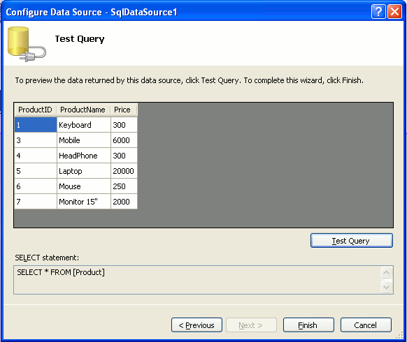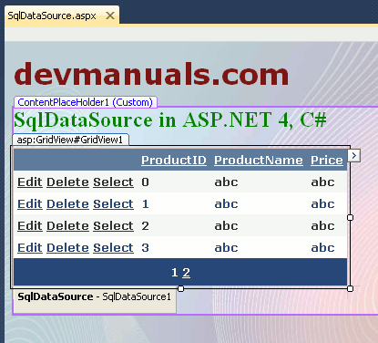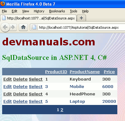 <%@ Page Title="" Language="C#" MasterPageFile="~/RoseindiaMaster.master" AutoEventWireup="true" CodeFile="SqlDataSource.aspx.cs" Inherits="SqlDataSource" %> <asp:Content ID="Content1" ContentPlaceHolderID="head" Runat="Server"> </asp:Content> <asp:Content ID="Content2" ContentPlaceHolderID="ContentPlaceHolder1" Runat="Server"> <div> <h2 style="color:Green">SqlDataSource in ASP.NET 4, C#</h2> <asp:GridView ID="GridView1" runat="server" AllowPaging="True" AllowSorting="True" AutoGenerateColumns="False" CellPadding="4" DataKeyNames="ProductID" DataSourceID="SqlDataSource1" Font-Bold="True" Font-Names="Verdana" Font-Size="Small" ForeColor="#333333" GridLines="None" PageSize="4"> <AlternatingRowStyle BackColor="White" ForeColor="#284775" /> <Columns> <asp:CommandField ShowDeleteButton="True" ShowEditButton="True" ShowSelectButton="True" /> <asp:BoundField DataField="ProductID" HeaderText="ProductID" ReadOnly="True" SortExpression="ProductID" /> <asp:BoundField DataField="ProductName" HeaderText="ProductName" SortExpression="ProductName" /> <asp:BoundField DataField="Price" HeaderText="Price" SortExpression="Price" /> </Columns> <EditRowStyle BackColor="#999999" /> <FooterStyle BackColor="#5D7B9D" Font-Bold="True" ForeColor="White" /> <HeaderStyle BackColor="#5D7B9D" Font-Bold="True" ForeColor="White" /> <PagerStyle BackColor="#284775" ForeColor="White" HorizontalAlign="Center" /> <RowStyle BackColor="#F7F6F3" ForeColor="#333333" /> <SelectedRowStyle BackColor="#E2DED6" Font-Bold="True" ForeColor="#333333" /> <SortedAscendingCellStyle BackColor="#E9E7E2" /> <SortedAscendingHeaderStyle BackColor="#506C8C" /> <SortedDescendingCellStyle BackColor="#FFFDF8" /> <SortedDescendingHeaderStyle BackColor="#6F8DAE" /> </asp:GridView> <asp:SqlDataSource ID="SqlDataSource1" runat="server" ConnectionString="<%$ ConnectionStrings:ChartDatabaseConnectionString %>" DeleteCommand="DELETE FROM [Product] WHERE [ProductID] = @ProductID" InsertCommand="INSERT INTO [Product] ([ProductID], [ProductName], [Price]) VALUES (@ProductID, @ProductName, @Price)" SelectCommand="SELECT * FROM [Product]" UpdateCommand="UPDATE [Product] SET [ProductName] = @ProductName, [Price] = @Price WHERE [ProductID] = @ProductID"> <DeleteParameters> <asp:Parameter Name="ProductID" Type="Int32" /> </DeleteParameters> <InsertParameters> <asp:Parameter Name="ProductID" Type="Int32" /> <asp:Parameter Name="ProductName" Type="String" /> <asp:Parameter Name="Price" Type="String" /> </InsertParameters> <UpdateParameters> <asp:Parameter Name="ProductName" Type="String" /> <asp:Parameter Name="Price" Type="String" /> <asp:Parameter Name="ProductID" Type="Int32" /> </UpdateParameters> </asp:SqlDataSource> </div> </asp:Content>