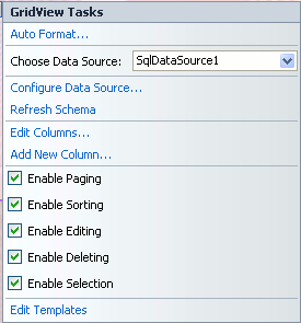 Now click smart tag button of GridView and enable paging, sorting, editing, deleting and selection.