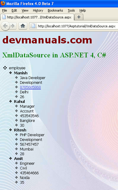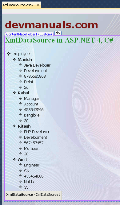 <%@ Page Title="" Language="C#" MasterPageFile="~/RoseindiaMaster.master" AutoEventWireup="true" CodeFile="XmlDataSource.aspx.cs" Inherits="XmlDataSource" %> <asp:Content ID="Content1" ContentPlaceHolderID="head" runat="Server"> </asp:Content> <asp:Content ID="Content2" ContentPlaceHolderID="ContentPlaceHolder1" runat="Server"> <div> <h2 style="color: Green"> XmlDataSource in ASP.NET 4, C# </h2> <asp:TreeView ID="TreeView1" runat="server" DataSourceID="XmlDataSource1" ImageSet="BulletedList4" ShowExpandCollapse="False" Width="181px"> <DataBindings> <asp:TreeNodeBinding DataMember="name" TextField="#InnerText" /> <asp:TreeNodeBinding DataMember="post" TextField="#InnerText" /> <asp:TreeNodeBinding DataMember="department" TextField="#InnerText" /> <asp:TreeNodeBinding DataMember="mobileno" TextField="#InnerText" /> <asp:TreeNodeBinding DataMember="city" TextField="#InnerText" /> <asp:TreeNodeBinding DataMember="age" TextField="#InnerText" /> <asp:TreeNodeBinding DataMember="person" TextField="name" /> </DataBindings> <HoverNodeStyle Font-Underline="True" ForeColor="#5555DD" /> <NodeStyle Font-Names="Tahoma" Font-Size="10pt" ForeColor="Black" HorizontalPadding="5px" NodeSpacing="0px" VerticalPadding="0px" /> <ParentNodeStyle Font-Bold="true" /> <SelectedNodeStyle Font-Underline="True" ForeColor="#5555DD" HorizontalPadding="0px" VerticalPadding="0px" /> </asp:TreeView> <asp:XmlDataSource ID="XmlDataSource1" runat="server" DataFile="~/XML/Employee1.xml"> </asp:XmlDataSource> </div> </asp:Content>