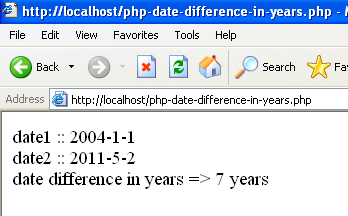 In this tutorial you will learn how to find PHP date difference in years in a PHP web application. In this tutorial $date1 and $date2 variable that use for assign date and $date_diff use for assign difference of dates in Unix timestamp (in second) . The " floor(($date_diff)/(60*60*24*365)) " that return number of years. The code of "php-date-difference-in-years.php" given below as :